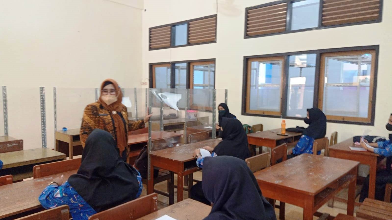 Ibu Kepala Dinas Pendidikan dan Kebudayaan memantau secara langsung proses peserta didik memasuki lingkungan sekolah dengan cek suhu otomatis, cuci tangan, dan tetap menjaga jarak memasuki ruang pembelajaran. Selanjutnya, beliau berkeliling untuk memantau KBM (Kegiatan Belajar Mengajar) di kelas secara langsung dan melihat beberapa ruang praktik di sekolah.